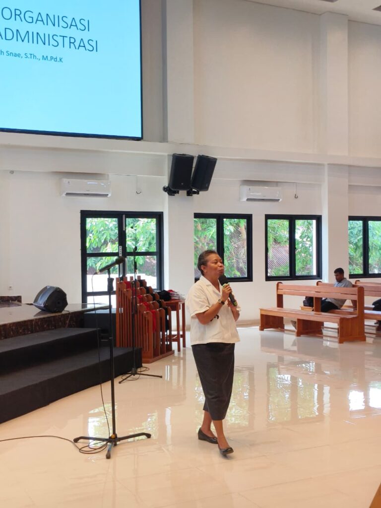 Kegiatan ini dibagi dalam dua kelompok utama sesuai bidang tugas masing-masing. Untuk Pegawai Sekretariat, materi dibawakan langsung oleh Ketua Majelis Klasis, Pdt. Delviana K. Poych–Snae, S.Th, M.Pd.K, dengan topik Pedoman Administrasi dan Organisasi. Materi ini menekankan pentingnya tertib administrasi, standar operasional dalam pengelolaan dokumen, serta pemahaman struktur organisasi GMIT sebagai dasar pelayanan yang efektif dan akuntabel.
